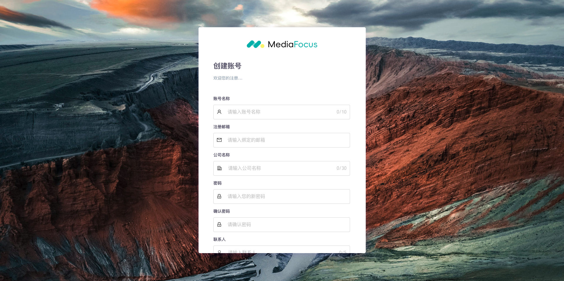 1)进入 MediaFocus 官方网站:MediaFocus 聚合广告平台 。 2)点击页面右上角【注册】。 3)依次填写注册信息。 4)勾选【我同意 MediaFocus 服务条款】。 5)确认填写信息无误后,点击【注册】,注册成功后即可登陆后台。