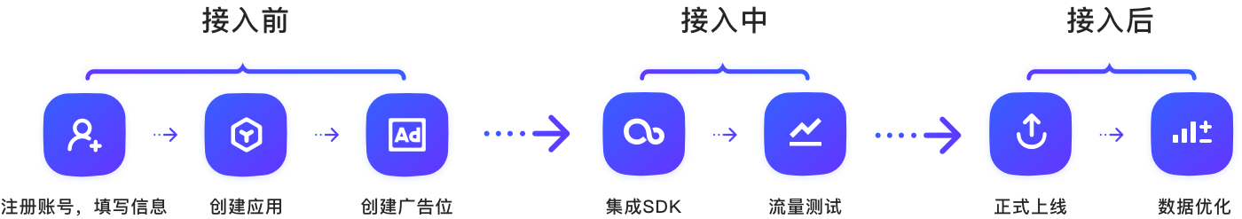 1)根据实际需要,确定需要接入的广告平台、广告类型。 2)注册广告平台的账号。 3)在各广告平台创建广告位。